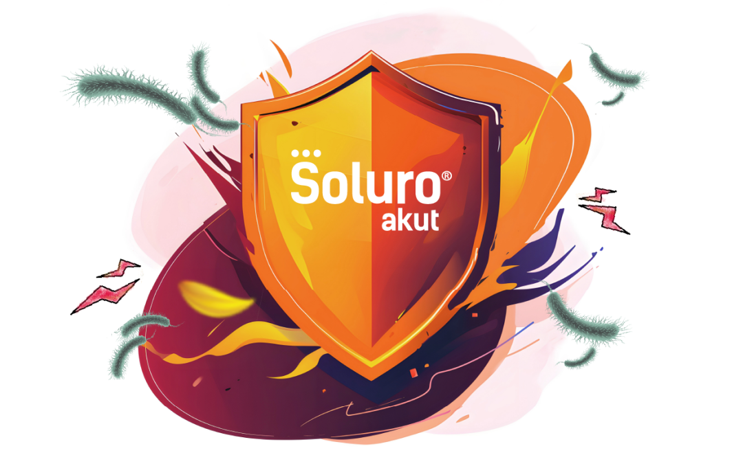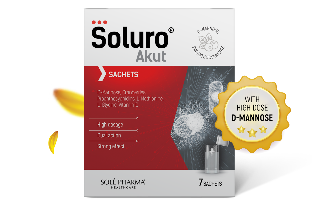 Soluro® Akut is for stopping and reducing the first acute and unpleasant symptoms of urinary tract infection. High doses at once start to inhibit bacteria adhesions and do not allow the growth of bacterial colonies (biofilm).
