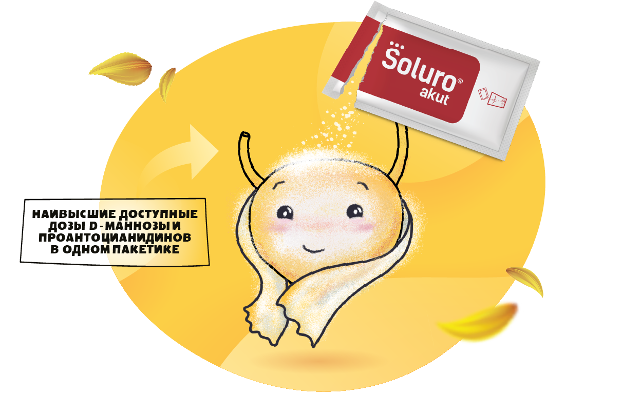 Применение Soluro® Akut является быстрым и простым, поскольку один пакетик содержит достаточно D-маннозы, чтобы его можно было использовать только один раз в день. При необходимости Soluro® Akut можно безопасно использовать более 1 пакетика в день.